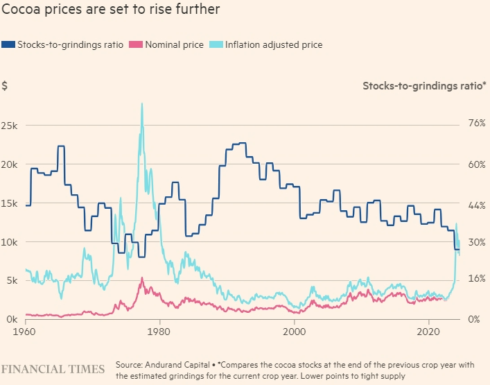 Аналогичное соотношение запасов и спроса привело к пику в 28 000 долларов за тонну с учётом инфляции в 1977 году после пятилетнего роста цен. Поскольку текущий рост цен длится всего год, а предложение, вероятно, будет снижаться в течение как минимум четырёх лет, есть все основания ожидать, что цены на какао достигнут новых максимумов с учётом инфляции.