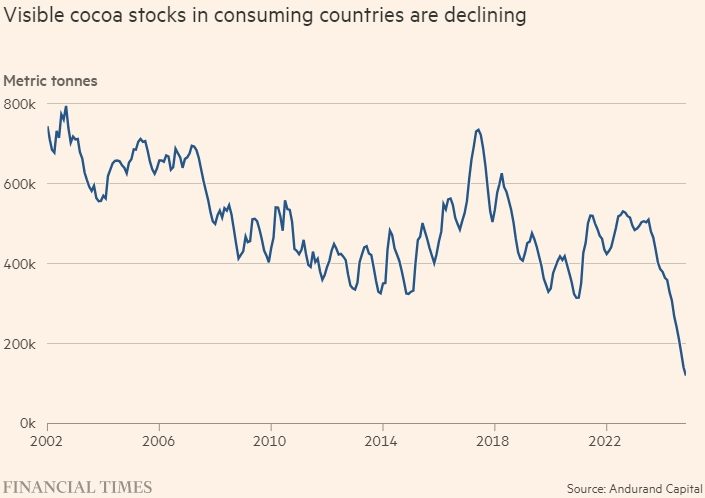 После резкого роста в первые четыре месяца года цены на какао-бобы несколько стабилизировались. В начале года стоимость тонны какао-бобов составляла около 4400 долларов, но к апрелю фьючерсные цены достигли пика в 12000 долларов, что значительно выше среднего показателя за десятилетие, скорректированного с учётом инфляции, который составляет 3400 долларов. Однако к маю цены упали до 7000 долларов за тонну. Однако, скорее всего, это временное затишье.
